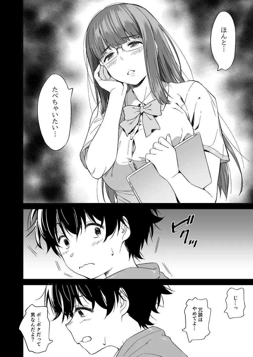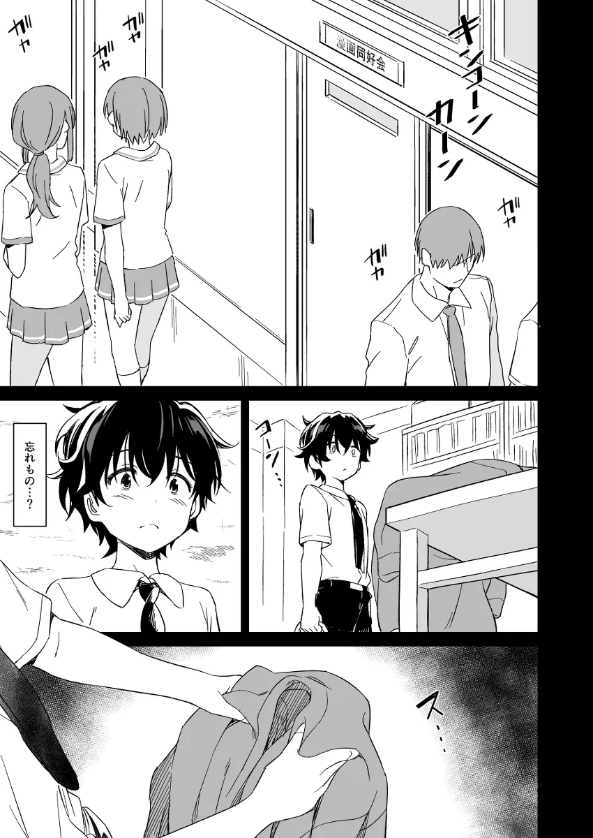 同学年のりんが立ち上げた漫画同好会に所属するあきらとあすか。りんはコスプレを嗜み、あすかはエロ同人を嗜む。唯一男のあきらはラノベが好きだった。それぞれがそれぞれの形で趣味を嗜む中、あきらはあすかにモデルをお願いされる。あすかはエロ同人を描いていたのだ。あすかの制服を着させられてエッチなポーズをするあきら。あすかの匂いにチンポが勃起してしまう。正面を向いてポーズをとろうとするも勃起のせいで正面をむけない。あすかはそっとスカートを脱いで優しく後ろからあきらを包み込む。一度射精する?小さいチンポが一生懸命勃起する姿を見てあすかも興奮したのだろう。二人はその場で結局セックスまでしてしまい…。