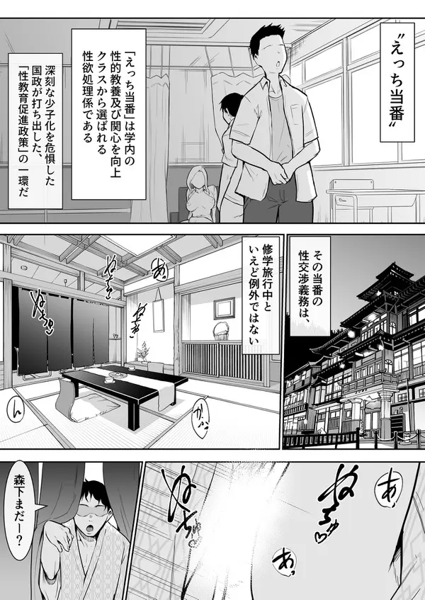 エッチ当番と言う制度がある学校。エッチ当番と言うのはクラスで盛った男子の性欲を鎮めるという性欲処理当番の事だ。精子を抜くのが主な仕事だ。深刻な少子化を懸念して政府が打ち出した政策の一環である。その当番になったものはいつどんなときであろうと男子の性処理をしなければならない。処女であろうがお構いなしにその当番に任命されれば、拒否することはできない。森下は処女でありながらこの当番に任命される。せめてイケメンを連れてきてという言葉も虚しく、最初の相手はブサイク男子。まさかこんな形で処女を失うことになるなんて…。