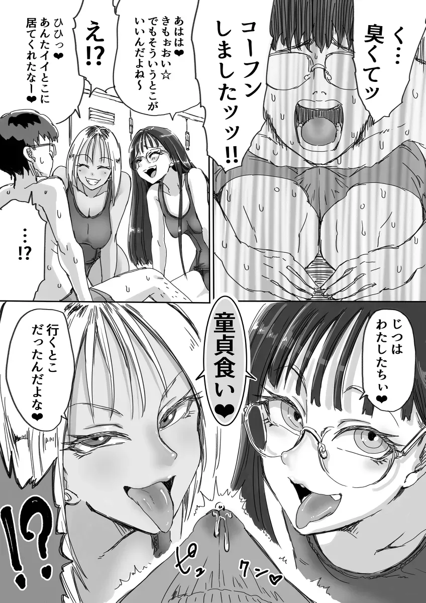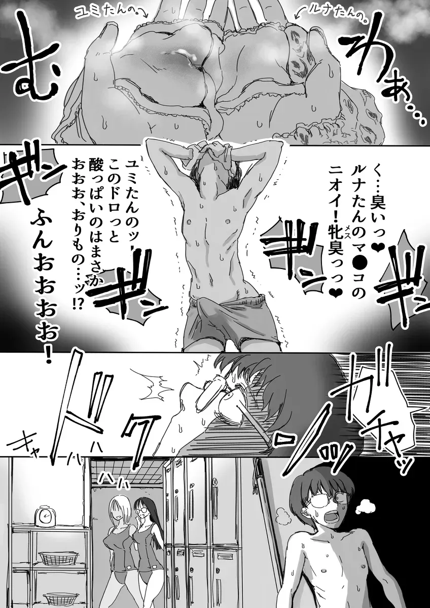 水泳の授業中、青田は女子更衣室に忍び込んでユミとルナの脱ぎたてパンツの匂いを嗅いでシコっていた。マンコ特有の何とも言えない臭さ、すっぱい濃いメス臭がたまらない。それを堪能しているとなんと二人が水泳の授業をサボって戻って来たのだ。青田はその現場を目撃されてただただ平謝りするしかなかった。ドン引きするのかと思ったら二人はなんと青田のチンポをしごきだす。二人は童貞が大好物だったようだ。授業が終わって他の生徒たちが帰ってくると、三人は清掃用具入れの中に隠れる。青田はそこで童貞を無事に卒業する。しかも初射精がマンコの中とは、なんとも羨ましい限りである。