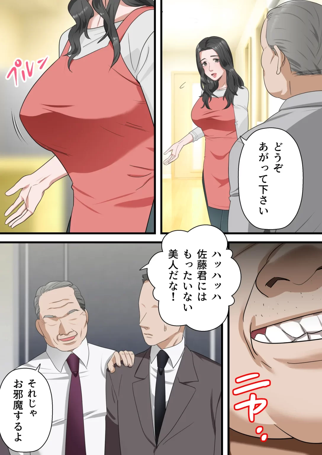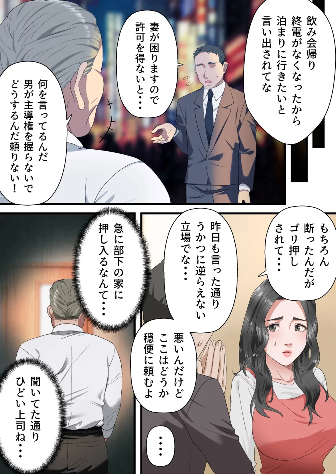 32歳の人妻マユは旦那の帰りを料理を作りながら待っていた。タクミが青ざめた表情で帰って来る。聞いた話によると職場で重大なミスをしてしまったらしい。しかしそれは部長に押し付けられたミスだ。まさにパワハラである。しかしそれがやっかいでその部長はかなりの権限を会社から委ねられていた。彼の機嫌を損ねれば今後の会社での立場が危うくなる。そして、後日タクミはそのパワハラ部長を家に連れてやってきた。マユは接待するもそれがあらぬ方向へと進んでいく。結局マユはその部長に生チンポを入れられてしまう。マンコの上の方ばかりをカリで擦られてマユは潮吹き絶頂して…。
