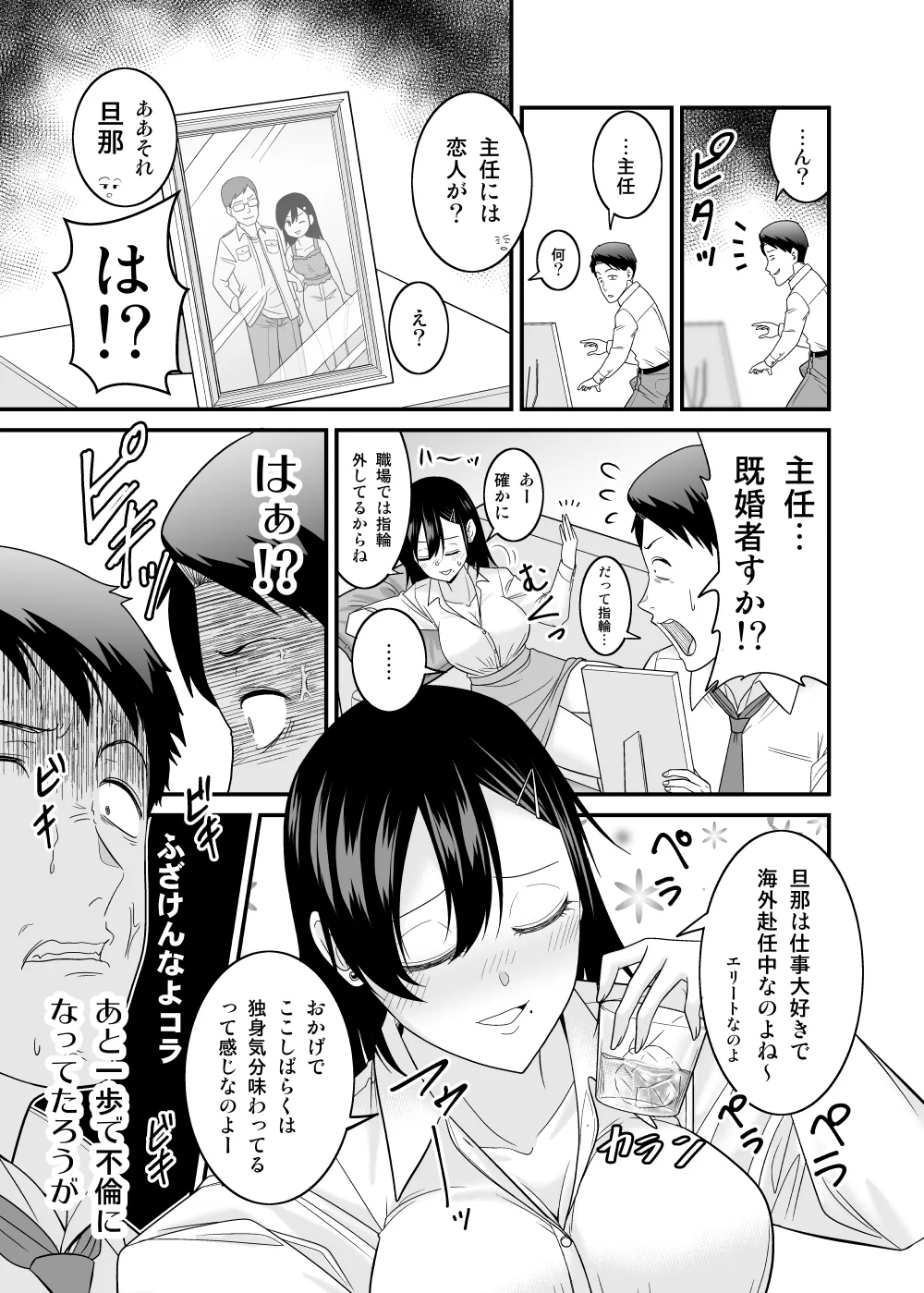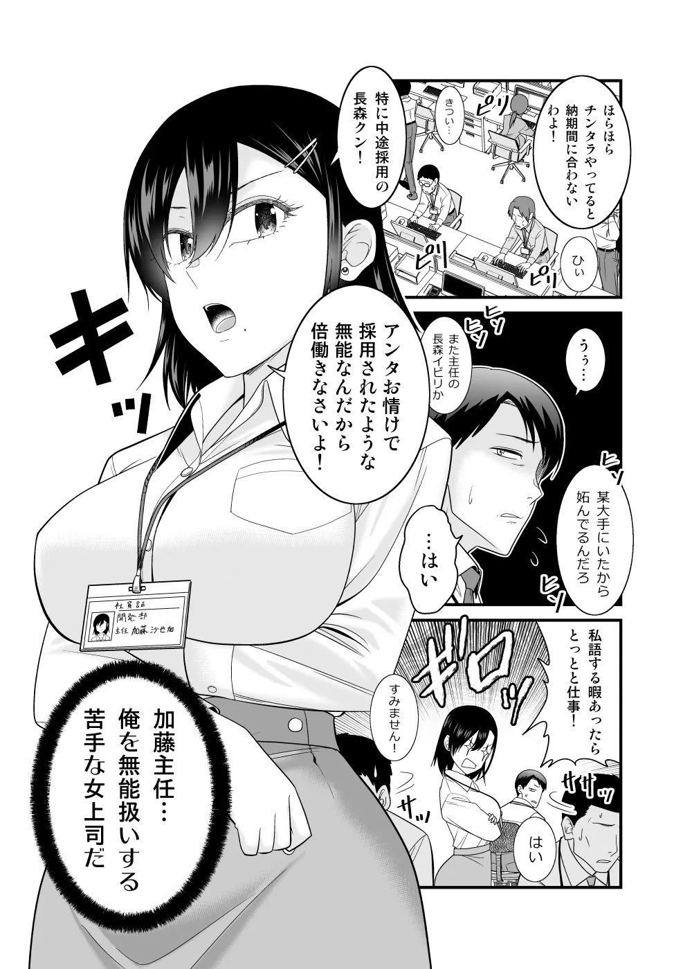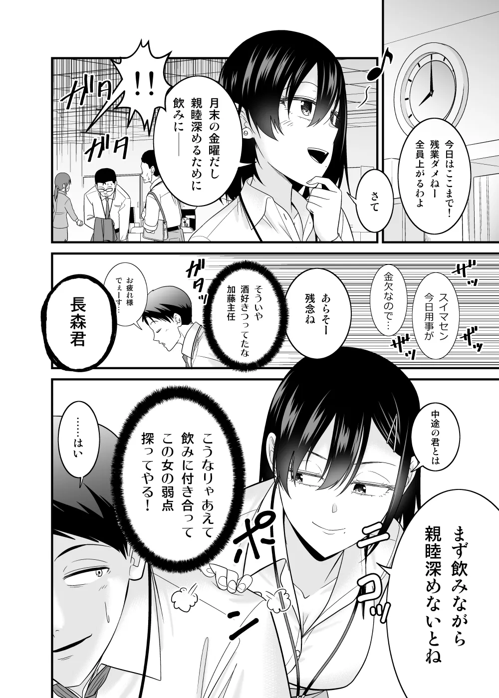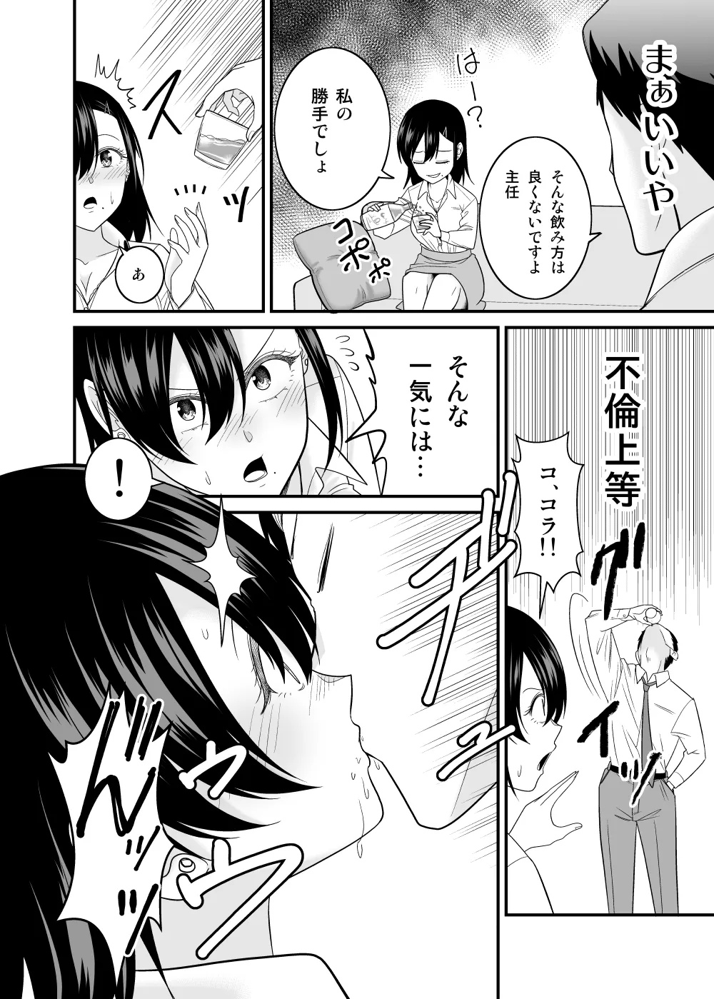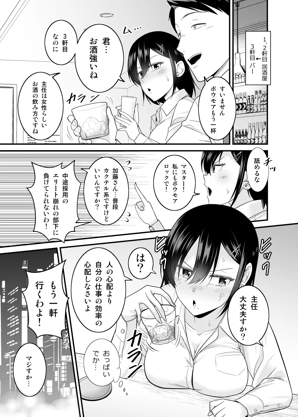 主人公の長森は、中途採用で入社してきた社員。だが、彼を指導する加藤主任は厳しく、仕事のミスを容赦なく叱るタイプの女上司だった。長森はそんな彼女を苦手に感じていたが、ある日、月末の仕事終わりに社員たちで飲みに行くことになる。飲みの席で、加藤主任はいつもの冷静な姿とは違い、酒に弱い一面を見せ始める。長森は彼女の弱点を探ろうとするが、酔った加藤主任の距離感はどんどん近くなり、普段の厳しい態度とのギャップに戸惑っていく。さらに、加藤主任には夫がいることが判明。長森は「これ以上はまずい」と理性で踏みとどまろうとするものの、酔いに任せて無防備になった加藤主任に振り回されて―。