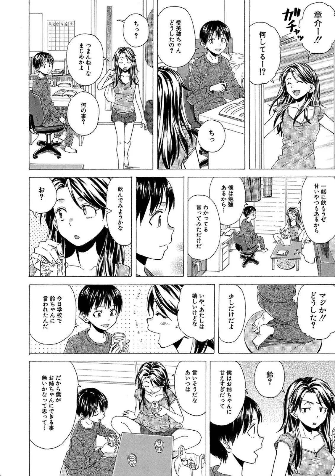 愛美と柚乃には可愛い弟がいる。名前は章介。エッチな事には全く興味が無いのか、非常にウブな弟だ。そんな弟にキスをしようとする愛美。特になんの疑いもなくキスをしようとする章介。小さいころからこういうスキンシップを姉ととっていたため全く抵抗が無い。しかしもう良い年頃である。ある時、愛美と二人きりになった時に本当にキスをしてしまう章介。しかもただのキスではなくて恋人同士がするような非常に深いキスである。章介は、それに性的興奮を覚えてガチ勃起。愛美はそれを見てたまらずフェラをしてしまう。それからどんどんエロい行為はエスカレートして近親相姦までしてしまい…。